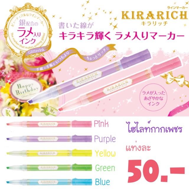 KIRARICH ปากกาเน้นข้อความฟรุ้งฟริ้ง สีสวยมากค่ะ ลากปรื๊ดมากากเพชร สินค้าคุณภาพนำเข้าจากญี่ปุ่น มีให้เลือก 5สี ชมพู ม่วง เหลือง เขียว ฟ้า kirarich kirarichpen